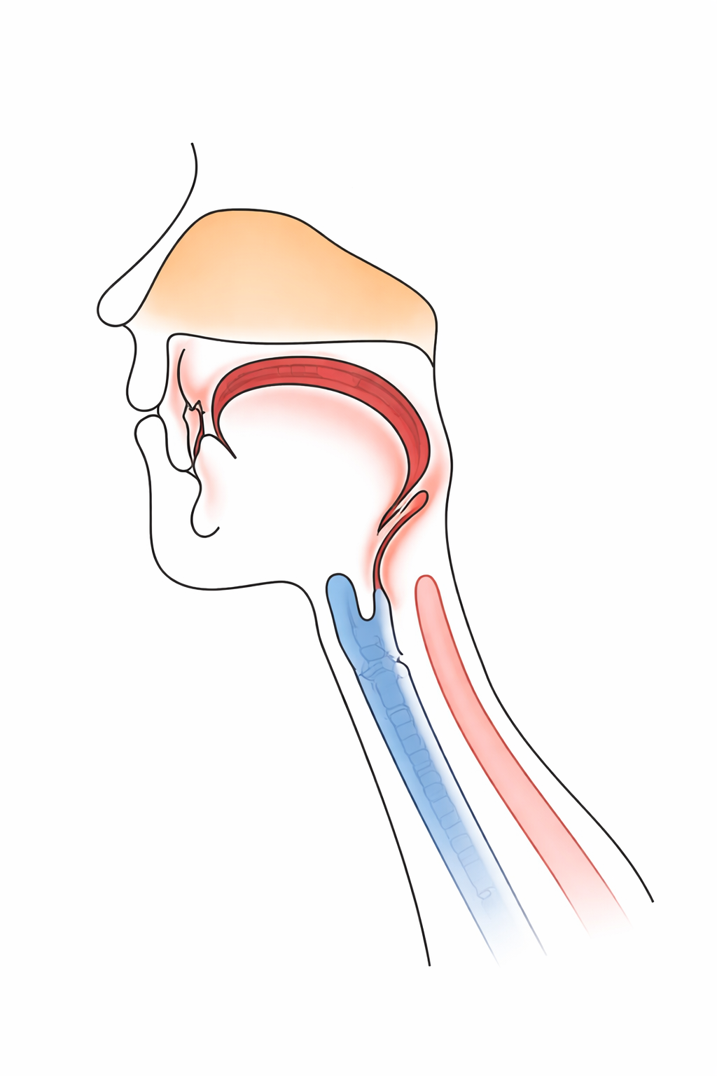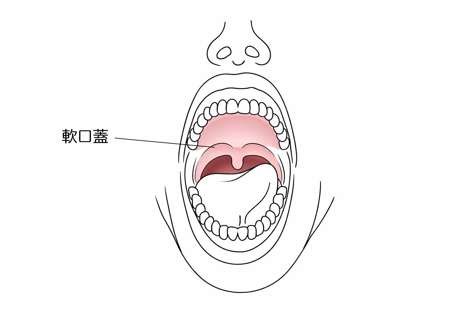 口の奥を鏡で見ると、のどの手前に「やわらかい部分」が見えます。これが「軟口蓋(なんこうがい)」です。